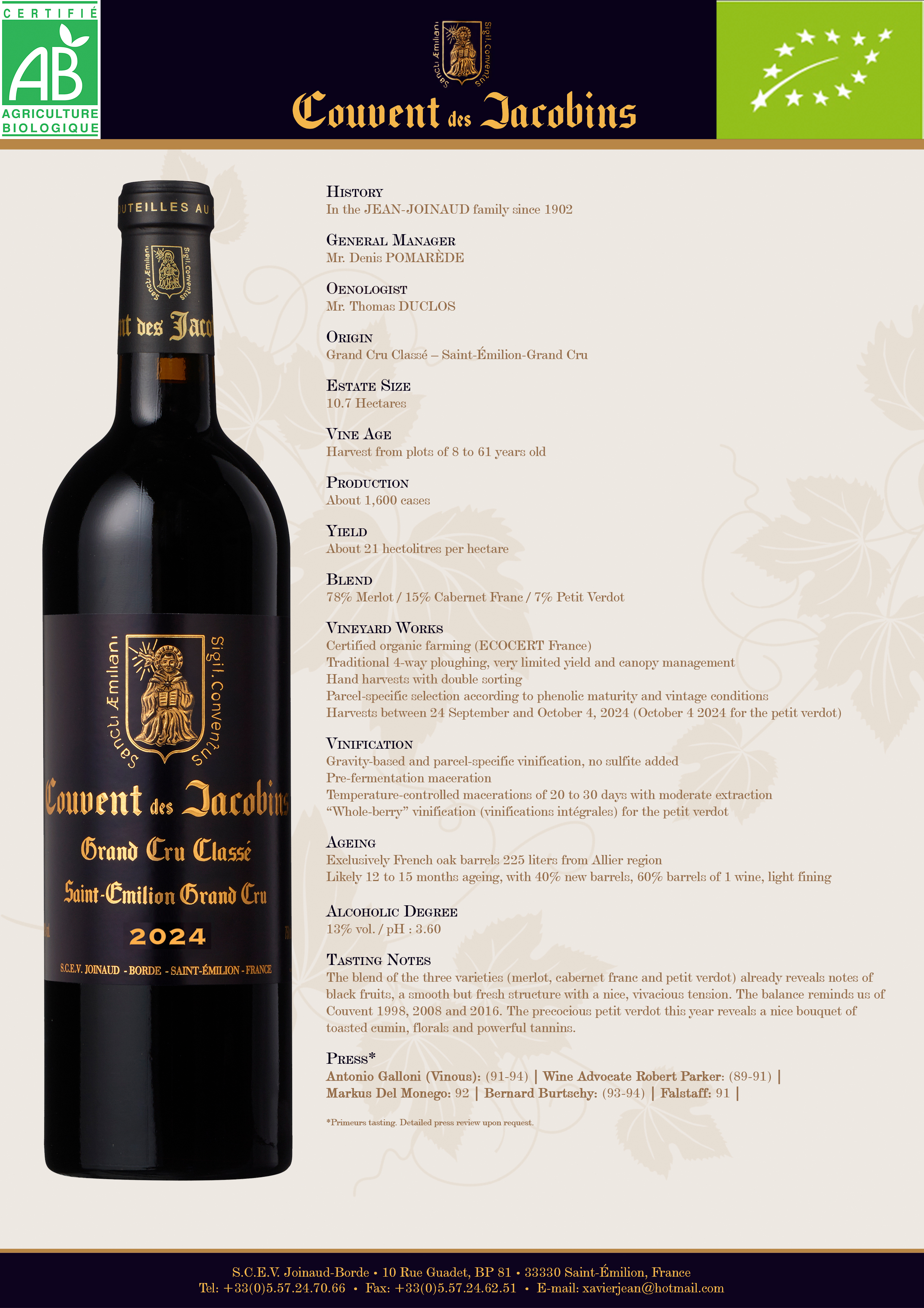 Jeb Dunnuck: "The 2024 Couvent Des Jacobins reveals meaty black cherries, leather, iron, and spicy notes on the nose. Nicely concentrated and medium-bodied on the palate, it has ripe, polished tannins and plenty of mid-palate depth, with a rock-solid personality. Tasted twice."